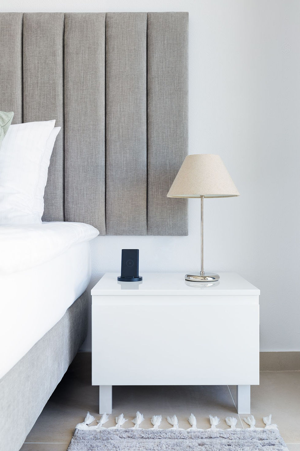 Jasne i nowoczesne wnetrze z widokiem na Morze Śródziemne – minimalistyczny design i subtelne pastelowe akcenty tworzące atmosferę relaksu.